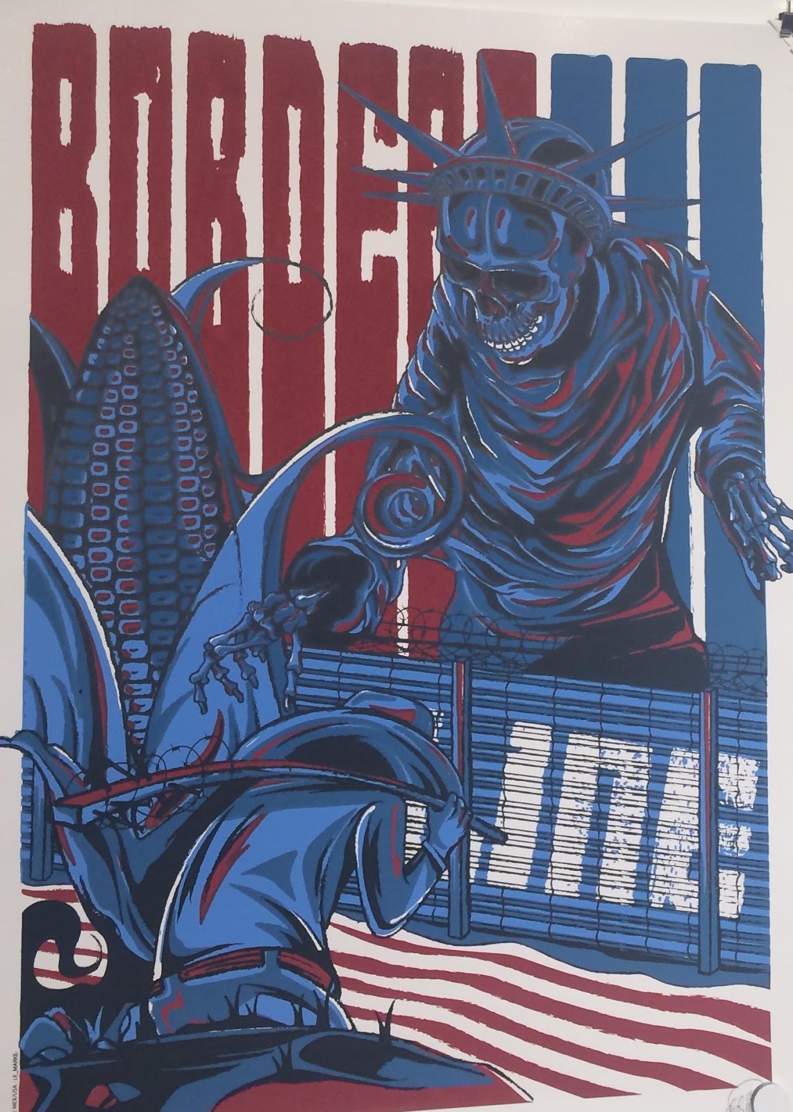 Un ejemplo concreto de esa critica es la pintura Mexicanos al grito de guerra de Antonio Aguirre Le Marke. Los colores rojo, azul y blanco, y la Estatua de la Libertad normalmente representan la libertad que ofrece los Estados Unidos. Sin embargo, en el cuadro la Estatua de la Libertad parece un esqueleto, insinuando que para los inmigrantes la única manera de obtener libertad es muriendo. Además, refleja la ironía de que los estadounidenses pueden cruzar la frontera cuando quieren pero los mexicanos, que trabajan en el campo y tienen el peso de un poste en su espalda (que representa el trabajo manual), no tienen ese lujo.