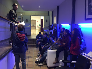 Llegamos bien, aunque cansados anoche a Madrid. Nuestro guía, Chip, nos encontró en el aeropuerto y nos trajo a nuestro hotel cerca de la estación de tren Atocha. El barrio está en el viejo centro de la ciudad, un área que se llama El Barrio de las Letras porque era un lugar donde muchos de los más famosos escritores frecuentaban. Nos encontramos en el hotel el tío de Marcos Acero, Fernando, quien vive aquí con su familia, y él nos dio una pequeña gira del barrio. Tiene calles estrechas y empedradas con inscripciones de autores importantes. También había muchos cafés al aire libre y tabernas llena de gente..¡Es un barrio con mucho ambiente, y me alegro de que nuestro hotel quede aquí y volveremos al mismo hotel cuando regresemos en unos días. Luego fuimos a cenar en un restaurante excelente. Comimos muchos platos típicos ricos: jamón serrano, quesos, paella con muchos mariscos, ensalada y chuletas de cerdo con papas. Al volver al hotel, nos reunimos con Chip para hablar del día próximo.