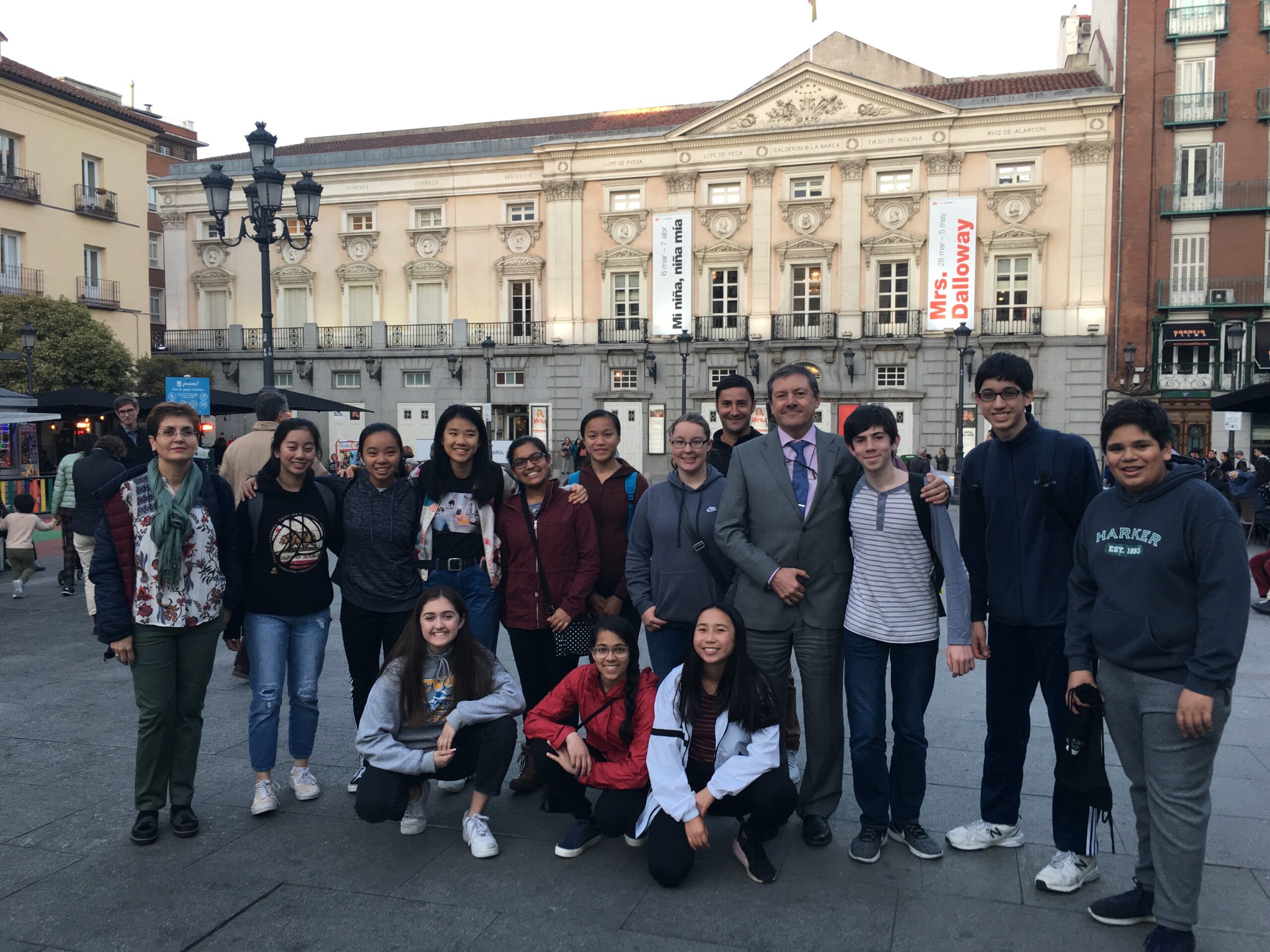 Llegamos bien, aunque cansados anoche a Madrid. Nuestro guía, Chip, nos encontró en el aeropuerto y nos trajo a nuestro hotel cerca de la estación de tren Atocha. El barrio está en el viejo centro de la ciudad, un área que se llama El Barrio de las Letras porque era un lugar donde muchos de los más famosos escritores frecuentaban. Nos encontramos en el hotel el tío de Marcos Acero, Fernando, quien vive aquí con su familia, y él nos dio una pequeña gira del barrio. Tiene calles estrechas y empedradas con inscripciones de autores importantes. También había muchos cafés al aire libre y tabernas llena de gente..¡Es un barrio con mucho ambiente, y me alegro de que nuestro hotel quede aquí y volveremos al mismo hotel cuando regresemos en unos días. Luego fuimos a cenar en un restaurante excelente. Comimos muchos platos típicos ricos: jamón serrano, quesos, paella con muchos mariscos, ensalada y chuletas de cerdo con papas. Al volver al hotel, nos reunimos con Chip para hablar del día próximo.