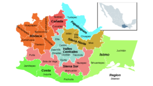 Me gustaría hacer una presentación sobre la lengua zapoteca de Santiago Laxopa. El zapoteca es una lengua indígena de las Américas y tiene características lingüísticas de los idiomas tonales y con estrés. En la imagen se puede ver el mapa del estado de Oaxaca, con la región de Sierra Norte en amarillo, y también el estado en relación con México.