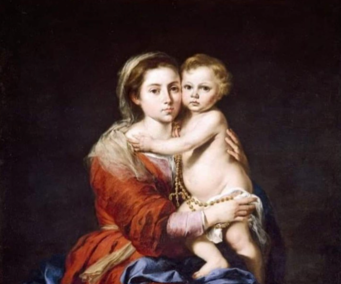 Esta pintura es La Virgen de Rosario, una pintura temprana pero famosa en la carrera de Murillo, que él hizo en 1650. Podemos ver su representación de la apariencia natural de María y el bebe Jesús, una característica muy común en el arte barroca, especialmente en las pinturas de artistas italianos como Caravaggio y artistas españoles como Diego Velázquez. Además Murillo usó la técnica barroca de claroscuro, donde había un gran contraste entre la luz y el oscuro. Pero Murillo presentó a la Virgen de una manera nueva, una manera más elegante con pinceladas más delicadas. Los colores luminosos y ricos también hacen hincapié en la calidad suave y etérea de la Virgen.
