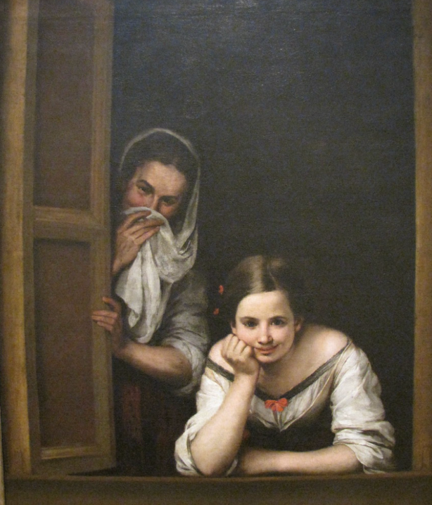 Esta pintura se llama Dos Mujeres a La Ventana, y fue pintada durante los años de 1655 a 1660. Esta pintura es muy similar a muchas pinturas durante la Edad de Oro de los holandeses, en que ellos pintaron mucho sobre la vida cotidiana. En la pintura de Murillo, podemos ver una representación realista de dos mujeres, una que está sonriendo y la otra que se está riendo pero con su boca cubierta por un pañuelo por etiqueta. Murillo presentó a las mujeres con claroscuro y una luz que enfatiza la alegría de las dos mujeres. La ventana sirve de  metáfora porque le permite a la audiencia un vistazo a un aspecto de la vida de las dos mujeres.
