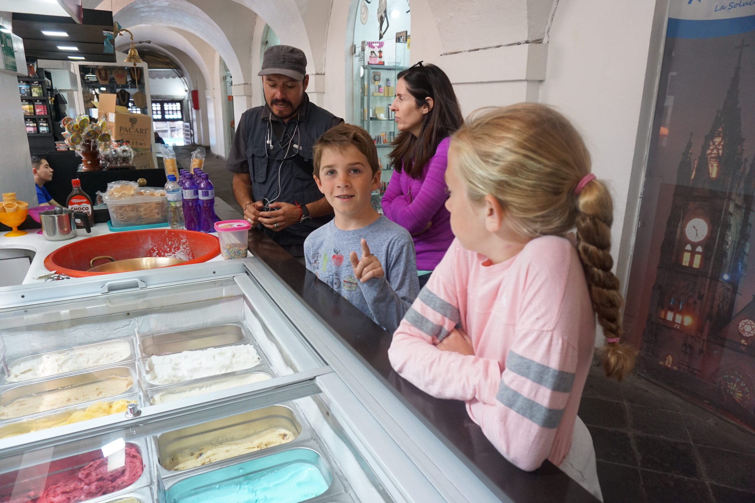 Después continuamos caminando por la ciudad. Nuestro guía nos dijo muchas cosas sobre la historia de la ciudad, que fue ocupada por los Incas hasta que España la colonizó en 1534. Por esa combinación de culturas, hay muchos sitios ricos de cultura e historia allí. Después de algún tiempo de caminar, encontramos un mercado. Había vendedores en todos lugares, gritando sobre la comida que estaban vendiendo, como plátanos, frijoles y frutas varias. Yo no había probado mucha de la comida antes en mi vida. Decidimos comprar un helado hecho con un estilo especial que se llama helado de paila, que es cuando el helado se hace a mano en una paila encima de hielo. ¡Era tan delicioso!